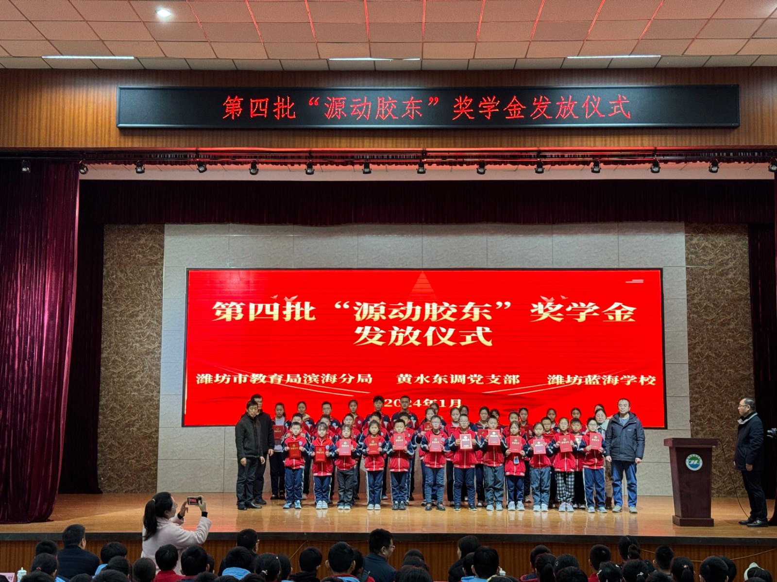 1月17日下午,黃水東調(diào)黨支部聯(lián)合濰坊藍海學(xué)校在藍海學(xué)校行政樓報告廳舉行了第四批“源動膠東”獎學(xué)金頒發(fā)儀式,對藍海學(xué)校2023學(xué)年榮獲獎學(xué)金的42名優(yōu)秀學(xué)生進行表彰。濱海區(qū)教育分局黨組成員、副局長袁玉松,山東水發(fā)黃水東調(diào)工程有限公司黨支部書記、董事長申勇,總經(jīng)理宋致軍,濰坊藍海學(xué)校黨支部書記、校長楊偉平等出席,共計300余名師生參加此次活動。